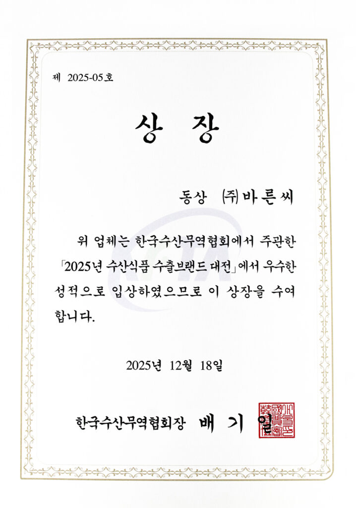 2025년 수산식품 수출브랜드 대전 수상 바른씨는 한국 수산무역협회에서 주관한 2025년 수산식품 수출 브랜드 대전에서 우수한 성적으로 입상으로 동상을 수상하였습니다. 앞으로도 […]